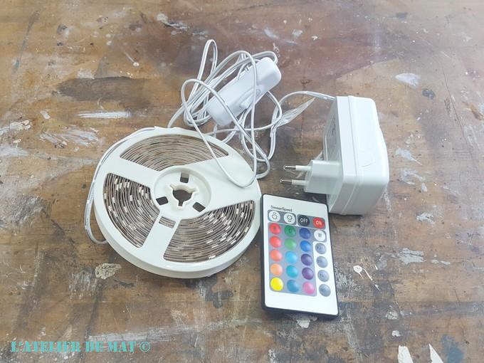 Apres avoir pris quelques mesures j’avais besoin d’un ruban d’environ 2.50m. C’est un peu la jungle le monde du ruban led j’ai l’impression. Il y a des prix du simple au triple, avec ou sans transformateur, et différentes longueurs. Pour ce projet j’en ai choisi un de 5 mètres car c’était moins cher qu’un de 3 mètres d’une autre marque. Des fois il ne faut pas chercher à comprendre ;).
