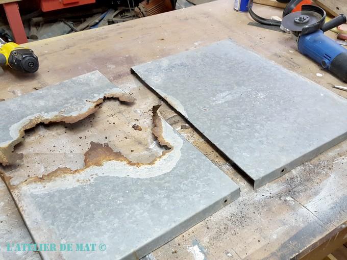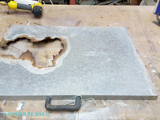 Comme je n’avais pas besoin de la totalité de la plaque, son état n’était pas très grave. J’ai coupé la partie saine avec ma meuleuse et j’ai aplati les bords à l’aide d’un marteau avant de continuer.