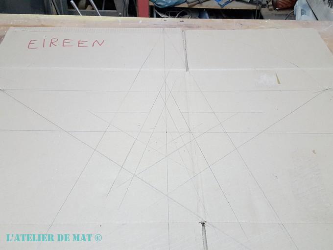 Avec une pointe j’ai tracé au dos de la plaque (les traits blancs) , l’étoile centrale en me servant de celle en bois comme gabarit puis j’ai rapidement tracé au marqueur mes lignes de découpe. Cette surcote permettra d’avoir de la matière pour l’assemblage final.