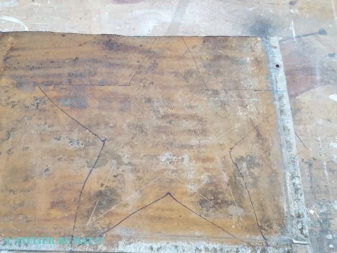 Mais pour bien faire ressortir le centre de mon étoile, j’avais encore du travail. Il y a quelques mois on m’a donné une vieille plancha et il y avait cette tôle en galva qui devait servir de couvercle.