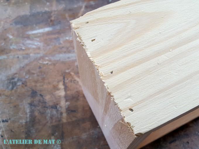 Le résultat peut paraître un peu grossier comme ça mais pas d’inquiétude. Le pin qui compose ce genre de tablette qu’on trouve dans le commerce est souvent assez « filandreux » et assez mou donc « travaillable » facilement.