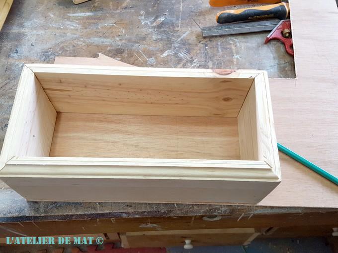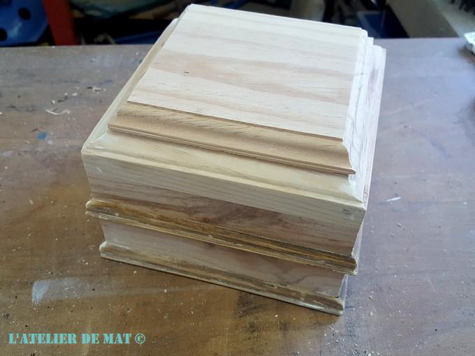 Bon bien sur j’ai fait trois boites sans savoir si j’aurais assez de « moulures » pour toutes les customiser. Et bien entendu cela n’a pas été le cas 😀 😀 . Il me fallait donc un plan B et c’est là que j’ai eu l’idée d’utiliser les chutes issues de la suppression des feuillures. Cette boite serait juste différente.