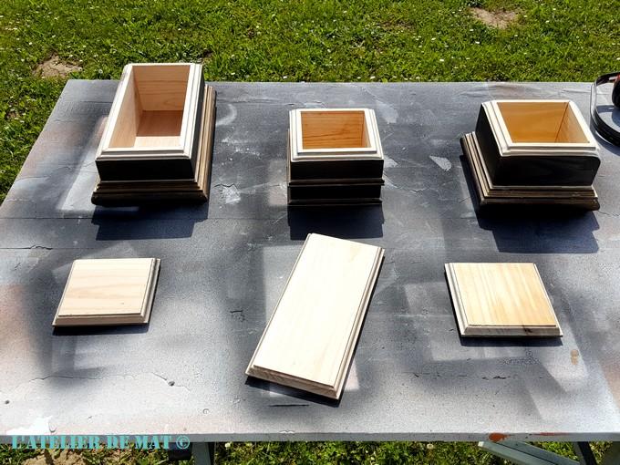 J’ai commencé comme à mon habitude par peindre le dessous des boites et ensuite j’ai attaqué l’autre coté. Pas d’inquiétude les boites ne seront pas noires. C’est plus une sous couche ici qu’autre chose 😉 .