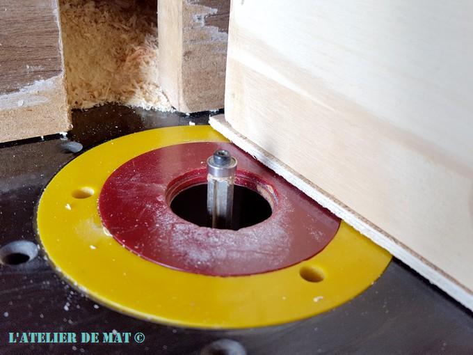 Et voila pourquoi je coupe les fonds un peu plus larges que prévu : j’ai une fraise à copier. Le roulement supérieur s’appuie sur la structure de la boite et le bas de la fraise va « couper » tout ce qui dépasse. Ce truc est génial. Bon après avec un rabot et/ou une râpe j’aurais pu faire la même chose.