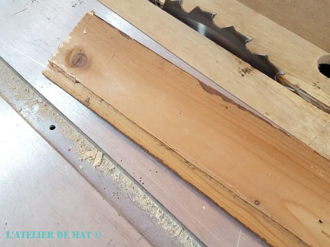 Le temps était venu de s’occuper du bois issu du cadre. Première opération : enlever cette petite feuillure (sur la gauche) afin d’avoir une baguette qui repose à plat. Avec ma scie sur table cette étape a pris moins de temps à faire que de vous la raconter 😉 .