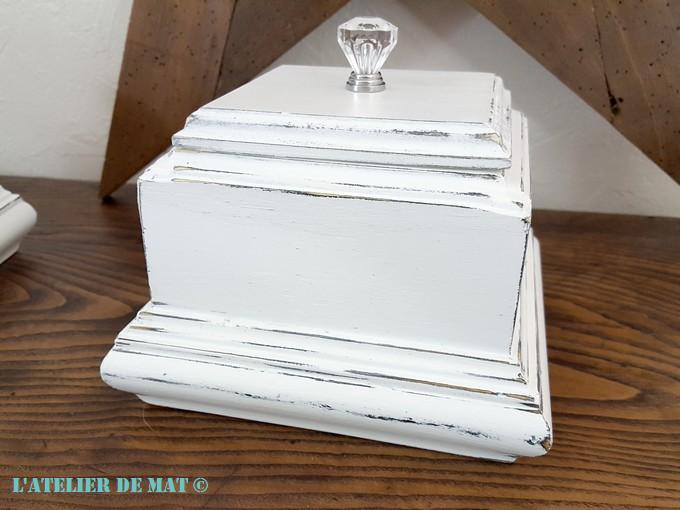 J’ai eu quelques doutes lors de la création de ces boites car je craignais que la moulure soit vraiment trop imposante. Et en fait une fois le tout peint en blanc, c’est ce qui donne toute l’originalité. Comme quoi il faut aller au bout de ses idées pour être sur du résultat 😉 .