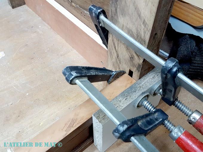 Je l’ai ensuite mise à la bonne dimension et je l’ai fixée aux montants grâce à un tasseau vissé dedans et dans le montant. Pour être sur d’être « à fleur » avec les montants, j’utilise une petite astuce : je fixe une chute de bois avec des serre-joints, ainsi lorsque je visse, les deux planches sont correctement alignées.