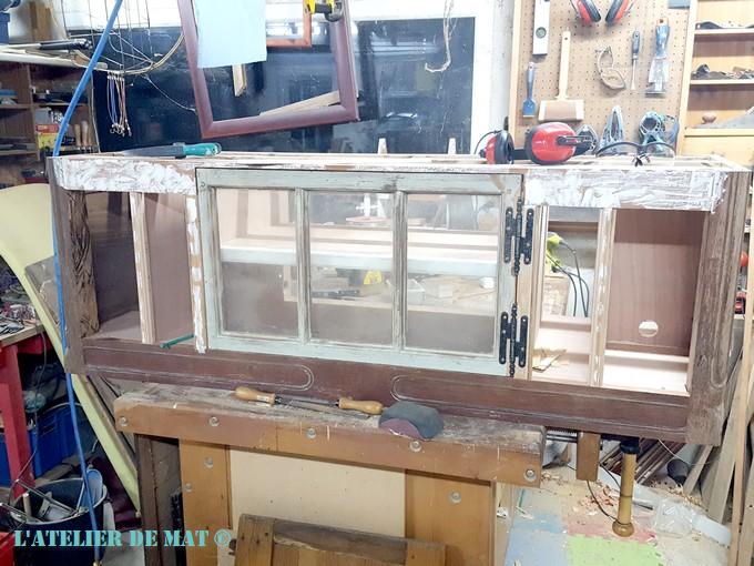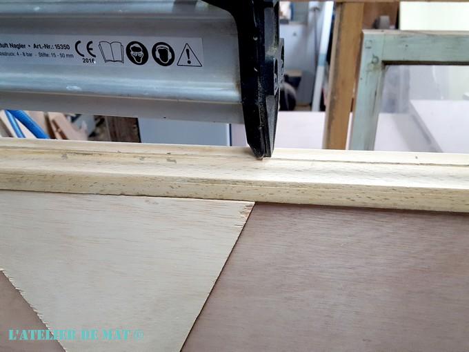 J’ai ainsi pu mettre en place la barre supérieure. J’ai dû pratiquer une découpe dans celle-ci pour accueillir la fenêtre. Comme j’ai la chance d’avoir une scie à ruban je me suis servi de cela, mais une scie sauteuse ferait le même boulot.