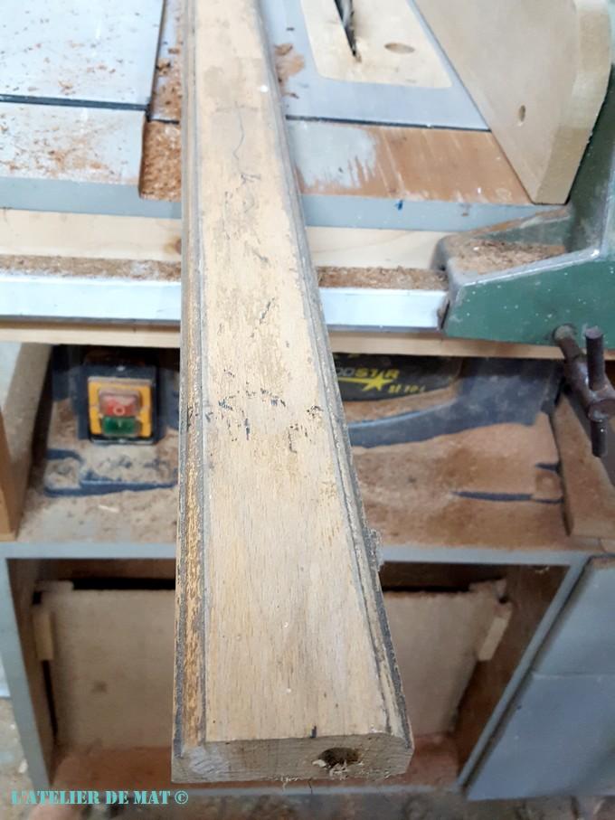 Un bon coup de scie pour récupérer la partie haute de la barre et un bon coup de ponçage et j’avais ma traverse supérieure. Elle est pleine de trous de vers mais avec un peu de mastic cela ne se verra pas 😀