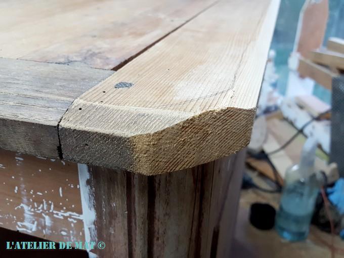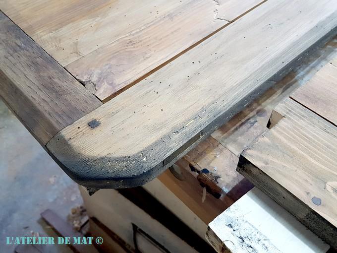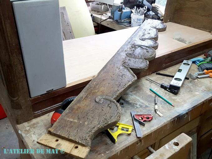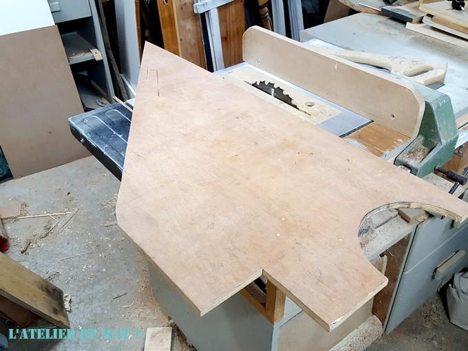 Les cotés du meuble étant arrondis , j’ai voulu recréer le même aspect sur le plateau. J’ai donc relevé la forme voulue et effectué une coupe grossière. Ensuite il a fallu jouer de la râpe à bois pour bien arrondir la coupe et surtout refaire le chanfrein.