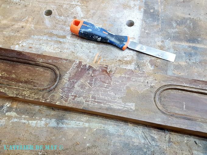 Pendant que la planche reposait encore à plat sur mon établi, j’en ai profité pour la décrasser. Ce n’est pas un jeu de mot, c’était vraiment une couche épaisse de crasse agglutinée par la cire au fil du temps…