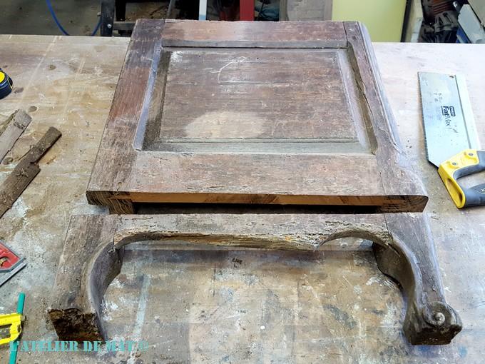 Le montant étant en chêne et assez épais, ma petite scie circulaire a peiné mais a fait le boulot. J’ai coupé en faisant en sorte de conserver la traverse à son maximum. Ça sera utile pour la suite. Pas top l’état du pied hein 😉 .