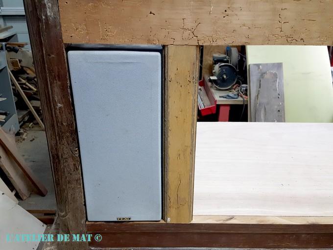 Les choses commençaient à se mettre en place. Pour me donner un aperçu j’ai positionné les séparations en contreplaqué. Comme je compte loger mes enceintes dans ce meuble, j’en ai sortie une du salon pour m’assurer que cela rentrerait bien. Il reste quand même encore pas mal de boulot pour en faire un truc sympa mais ça avance 😀 😀 .