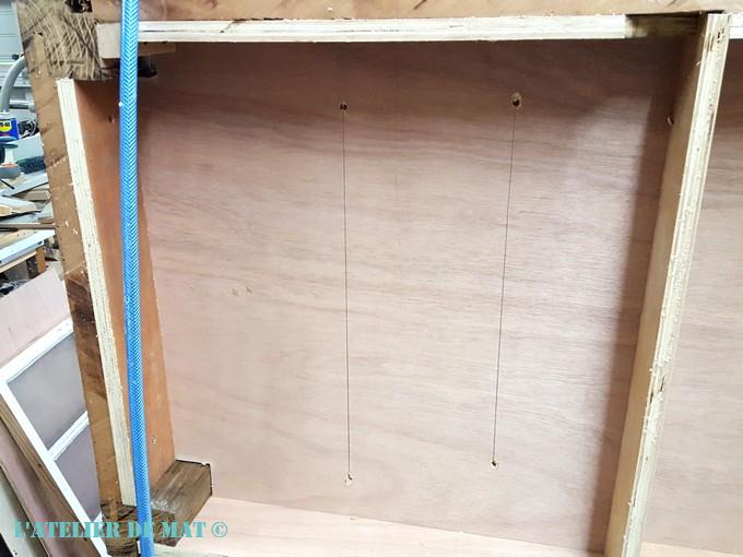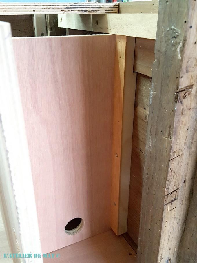 Au niveau des caissons où seront les enceintes, j’ai ajouté des séparations pour éviter qu’elles ne s’enfoncent trop dans le meuble. Ça permet aussi de consolider la structure en lui donnant du contreventement et éviter qu’elle bouge de droite à gauche.. 😉