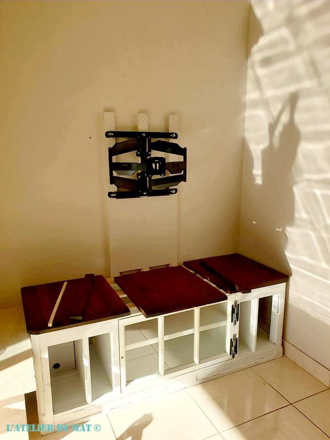 En principe je ne montre pas les photos de la mise en place car ce n’est pas très glamour mais je voulais vous faire voir l’installation dans son ensemble. J’ai peint la structure d’accroche de la télé dans la même couleur que celle du mur et j’ai fixé le bras de support dessus. Il ne me restait plus qu’à fixer le plateau et remplir le meuble 😀 😀 .