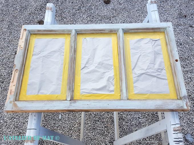 Et c’est parti pour la peinture ! J’ai pris le temps, et c’est long, de masquer les carreaux de la fenêtre avant de commencer à peindre. Ça me fera gagner du temps par la suite et cela sera beaucoup plus propre que de gratter les carreaux 😉 .