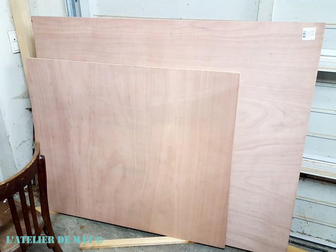 En prévision de la réalisation de ce meuble, j’ai fait un petit tour au Leroy à coté de chez moi pour acheter du contreplaqué en 15 mm. J’achète toujours un panneau entier que je fais découper pour qu’il rentre dans ma voiture. Cela revient beaucoup moins cher que d’acheter des morceaux aux côtes finales du projet.
