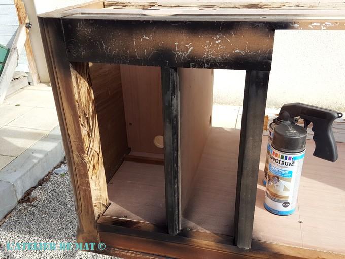 Afin de pouvoir patiner le meuble, j’ai appliqué un coup de peinture noire en bombe sur les parties les plus claires et surtout aux endroits que je voulais patiner. Ensuite j’ai peint tout le meuble en blanc à l’aide de mon pistolet basse pression.