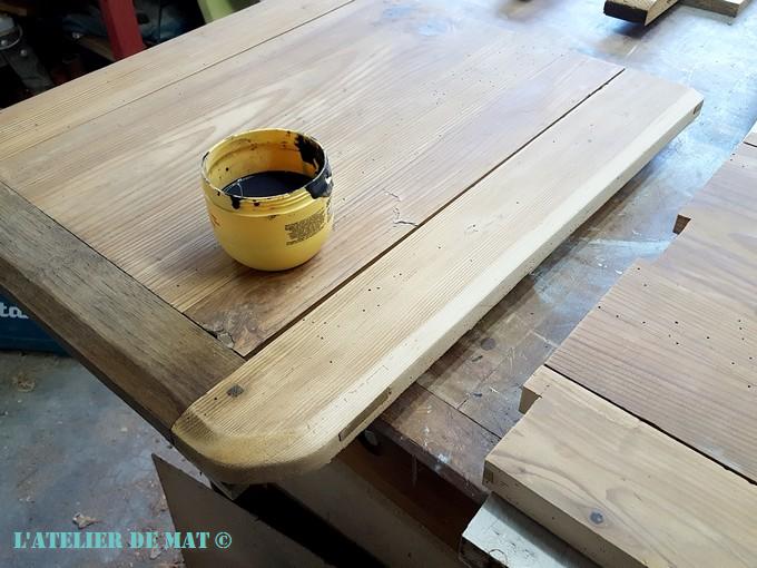 Pendant que la peinture séchait, je me suis attaqué à la finition du plateau. Afin de rattraper la différence de couleur entre les parties fraîchement chanfreinées et le reste, j’ai dilué de la peinture noire acrylique dans beaucoup d’eau.