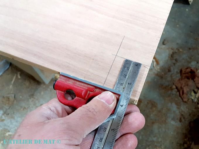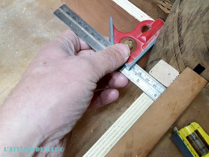 Grace à mon équerre à combinaisons, j’ai pris les mesures nécessaires pour découper les angles du panneau du fond.