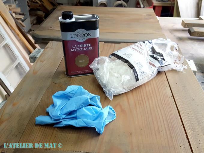 Cette mixture sèche très vite donc j’ai pu poncer le plateau rapidement avant de le teindre. Une paire de gants, de la mèche coton et une teinte couleur noyer et il n’y avait plus qu’a !
