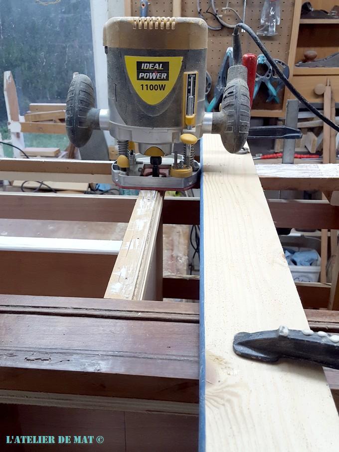 Il était temps désormais d’installer les gonds pour la fenêtre. Pour cela j’ai sorti ma vieille défonceuse que j’ai équipé d’une fraise droite. Pour être sûr d’aller bien droit j’ai fixé une chute de bois avec des serre-joints pour me faire un guide.