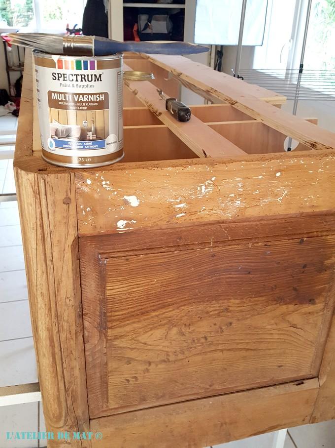 Et comme tout était ok, il ne reste plus qu’à lui donner son nouveau look. Les montants étant en chêne, j’ai appliqué une couche de vernis dessus pour éviter les remontées tanniques lors de la mise en peinture. C’est pas cher et cela marche pas mal du tout comme technique.