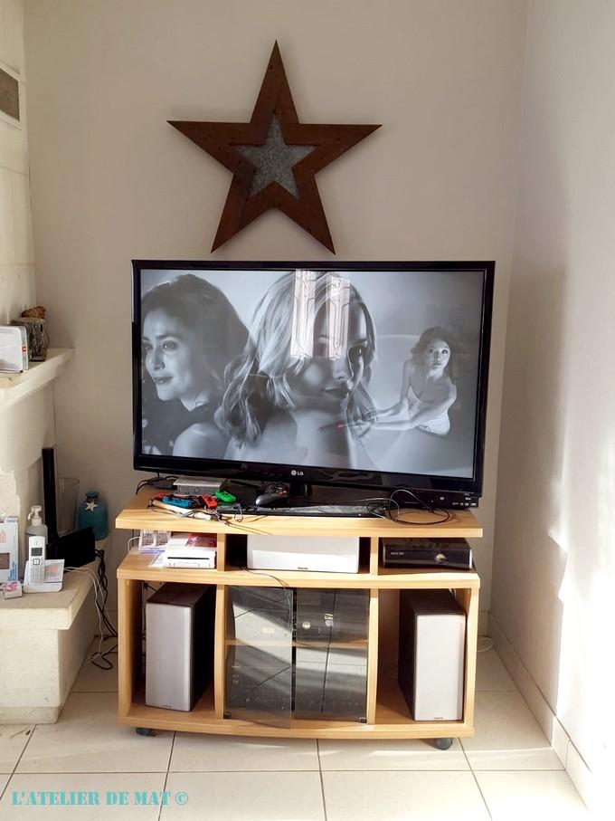 Aussitôt dit, aussitôt fait ! 😀 😀 . Bon en réalité cela a pris un peu de temps à tout réinstaller mais est-ce que cela n’en valait pas le coup ? J’ai maintenant un beau meuble sur mesure et toute la famille l’adore. En plus il se marie parfaitement avec l’étoile que j’avais réalisée dans cet article.