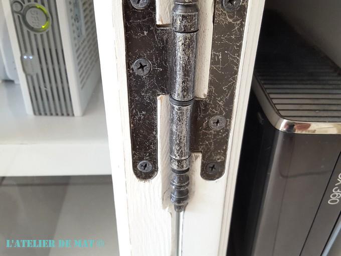 Les charnières en style vieilli se prêtent aussi pas mal. Je ne vous cache pas que ce ne sont pas les plus faciles à mettre en place, mais je ne voulais pas de charnières basiques qui auraient pu jurer avec le reste du meuble. De mon point de vue ça valait le coup de se galérer un peu 😉 .