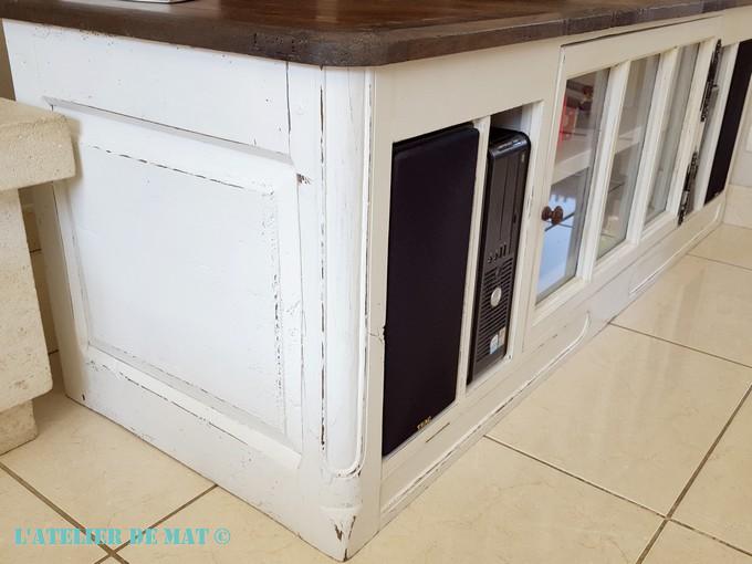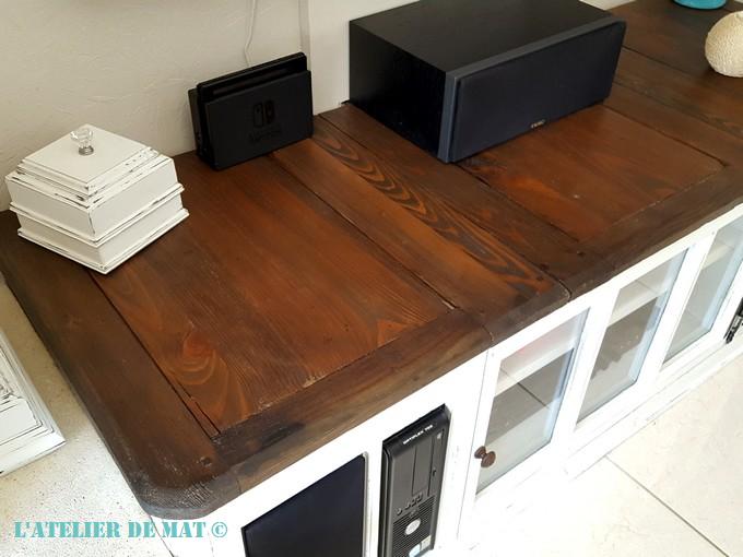 Pour le moment les cotés du meuble ne sont pas visibles car l’espace est réduit mais viendra un jour où il trônera au milieu d’un grand salon et il pourra laisser admirer ses vieux panneaux d’armoire.