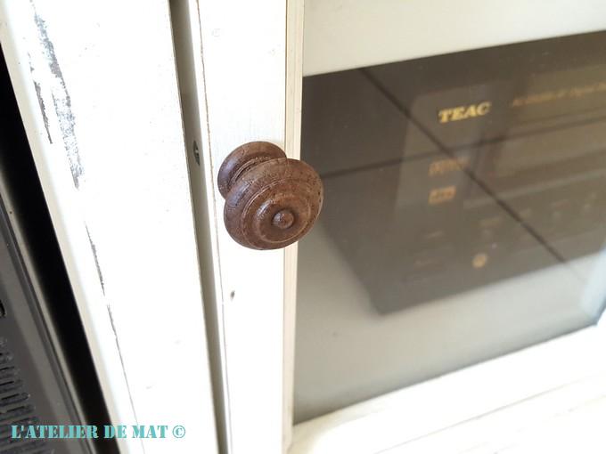 Pour la poignée de fenêtre j’ai fait très simple. J’avais cette vieille poignée de meuble en un seul exemplaire et comme elle collait bien au style du meuble, c’était l’occasion idéale pour l’utiliser.