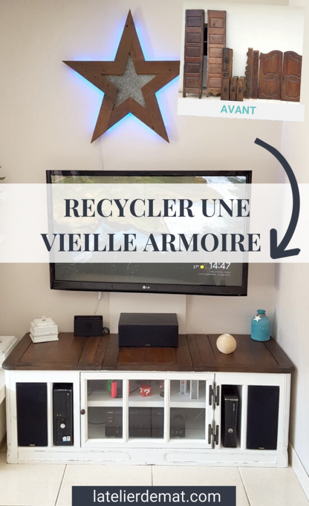 Je vous en parlais dans mon dernier post, l’article d’aujourd’hui va porter sur la création d’un meuble multimédia. Et au programme beaucoup de recyclage. Je vais me servir notamment d’une vieille armoire, d’un morceau de table, de rallonges d’une autre ainsi que d’une fenêtre. Oui rien que ça 😉 . J’en entends déjà certains dire que c’est dommage car c’était une armoire en chêne. Il faut savoir que je n’avais pas les étagères, le fond ni la corniche et que j’ai essayé de la vendre pendant 2 ans sans succès. J’avais même accepté une proposition à 20€ d’un ébéniste qui voulait la refaire, mais il a jugé qu’elle était en trop mauvais état. La recycler en divers projets lui offrira donc de nouvelles vies.